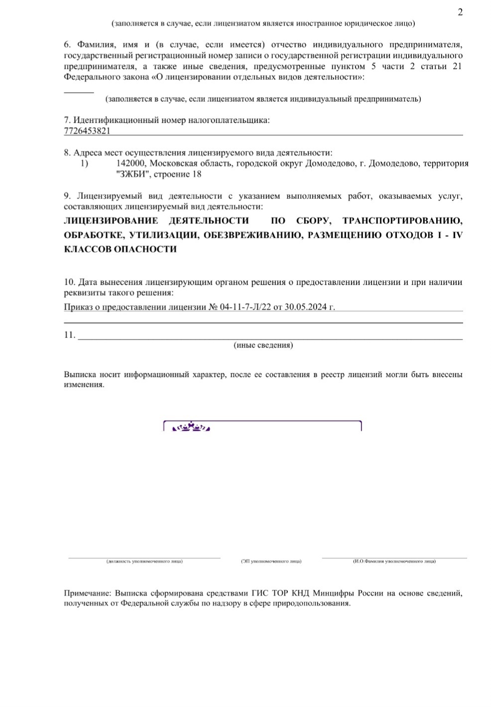 ДЕЯТЕЛЬНОСТИ ПО СБОРУ, ТРАНСПОРТИРОВАНИЮ, ОБРАБОТКЕ, УТИЛИЗАЦИИ, ОБЕЗВРЕЖИВАНИЮ, РАЗМЕЩЕНИЮ ОТХОДОВ I - IV КЛАССОВ ОПАСНОСТИ № Л020-00113-77/01225434